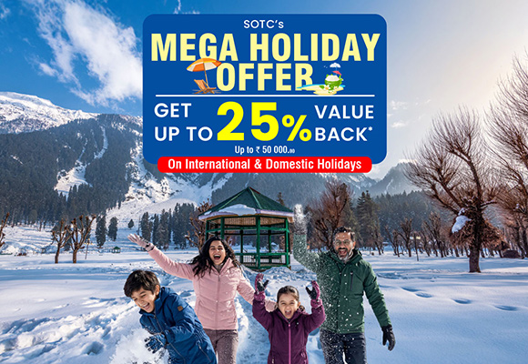 The offer is valid on all GIT products and wont be applicable on customized packages and third-party products. Value Back will be awarded in the form of reward points, which can be redeemed against the next holiday. Points awarded will be 25% of the sale value of the holiday or Rs.50,000, whichever is lower. Points awarded up to Rs. 50000 per booking, is subject to a minimum number of 2 pax per booking. Travel for the first booking must be completed before 30th June 2026. Points will be awarded after the travel for the first holiday is concluded. Redemptions will be allowed only for lead passenger mentioned against the Booking ID. Points are not transferable. Awarded Points will be valid for redemptions on holidays till 30th Dec 26 for travel before 30th May 27. Redemptions will be applicable on select products only. Travel Agents will not be eligible for the promo, unless they make the booking in the customer’s name & mobile number. SOTC reserves the right to extend the promo duration. This offer cannot be combined with any other existing discount or offer. Not applicable on Chardham, Mansarovar, Third Party products, AIR, Standalone hotels and Customised tours.